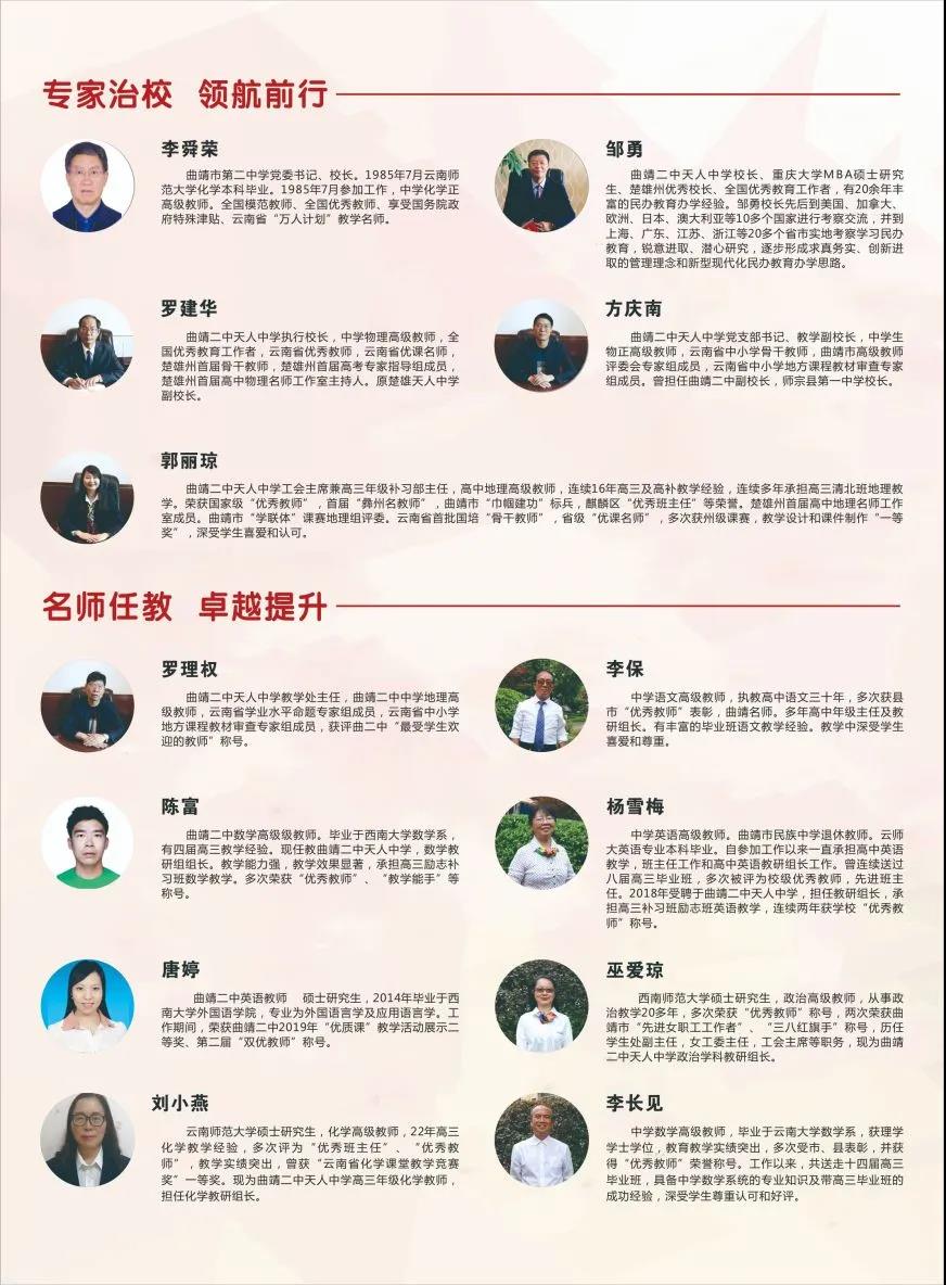 曲靖二中天人中學(xué)是由曲靖市麒麟?yún)^(qū)政府牽頭,與省一級一等高中曲靖第二中學(xué)合作興辦的一所民辦高中。曲靖二中派遣優(yōu)秀教師到校任教,并派遣優(yōu)秀管理管理團隊負(fù)責(zé)教學(xué)管理,為學(xué)校發(fā)展提供強大助力。