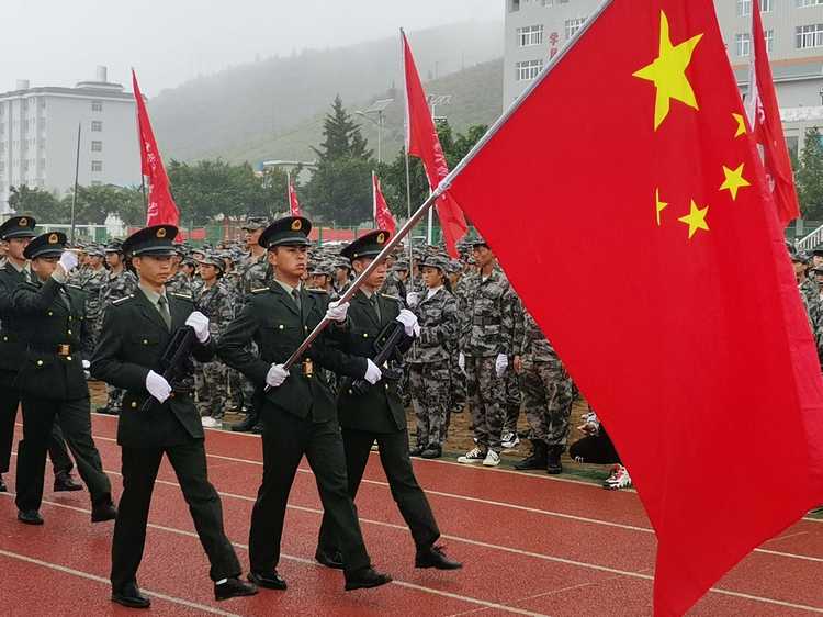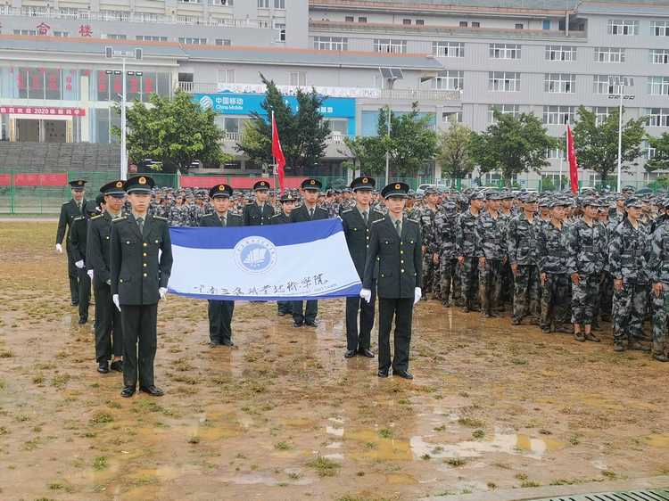 雖然天空不做美,茫茫秋雨,淅淅瀝瀝地下著,但是絲毫沒(méi)有影響受訓(xùn)新生的心情,伴隨著莊嚴(yán)的國(guó)歌,新生們身穿整潔軍訓(xùn)服裝,站著標(biāo)準(zhǔn)軍姿,昂首挺胸,陽(yáng)光向上,目光如炬,朝氣蓬勃。