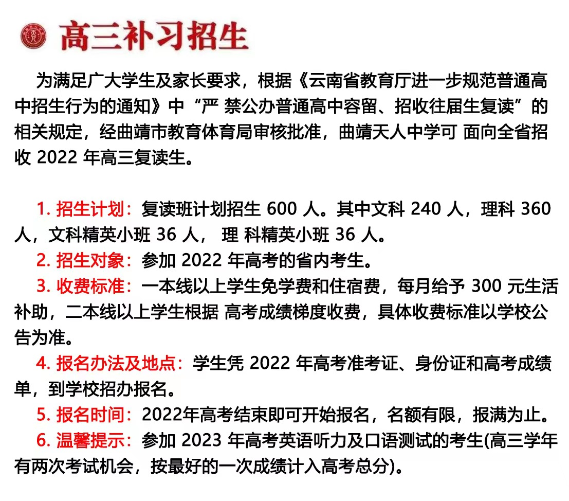 曲靖天人高級(jí)中學(xué)(2022年高三補(bǔ)習(xí)招生指南)