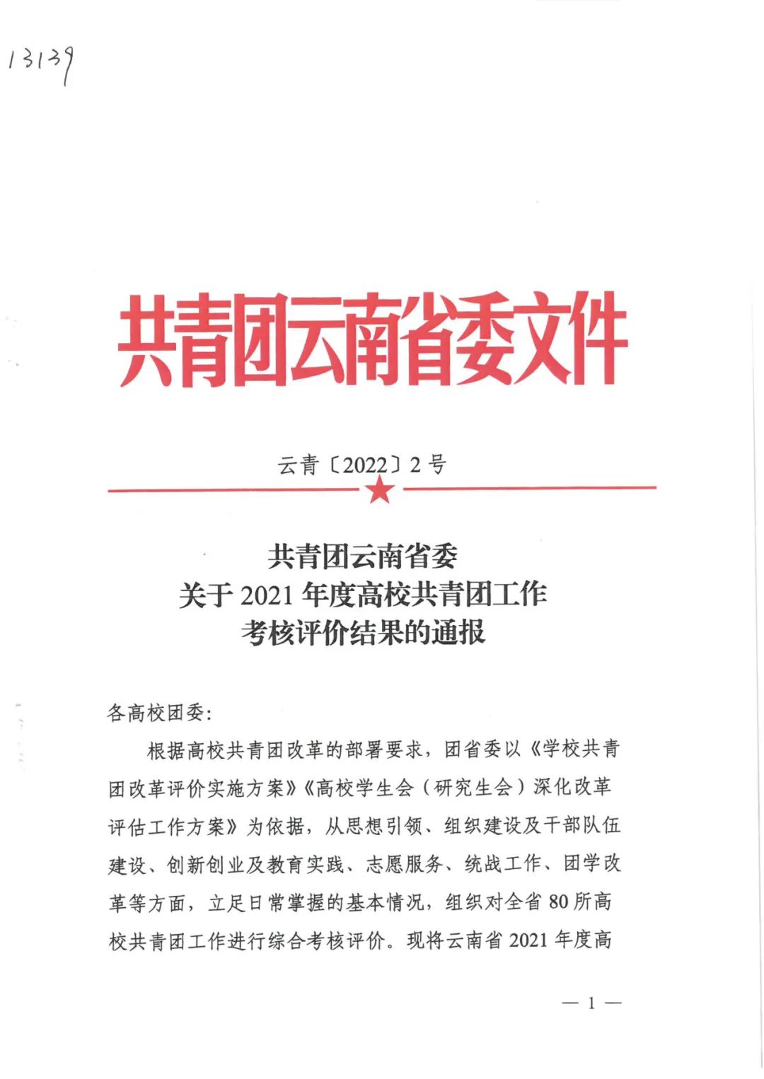 在2021年年度檢查工作中,經(jīng)共青團(tuán)云南省委考核,我校團(tuán)委被評定為“好”。此次考核全省所有高校參評,民辦院校21所中獲評為“好”的共計(jì)4所,我校是全省唯一一所獲得最高等級評定的民辦?圃盒。
