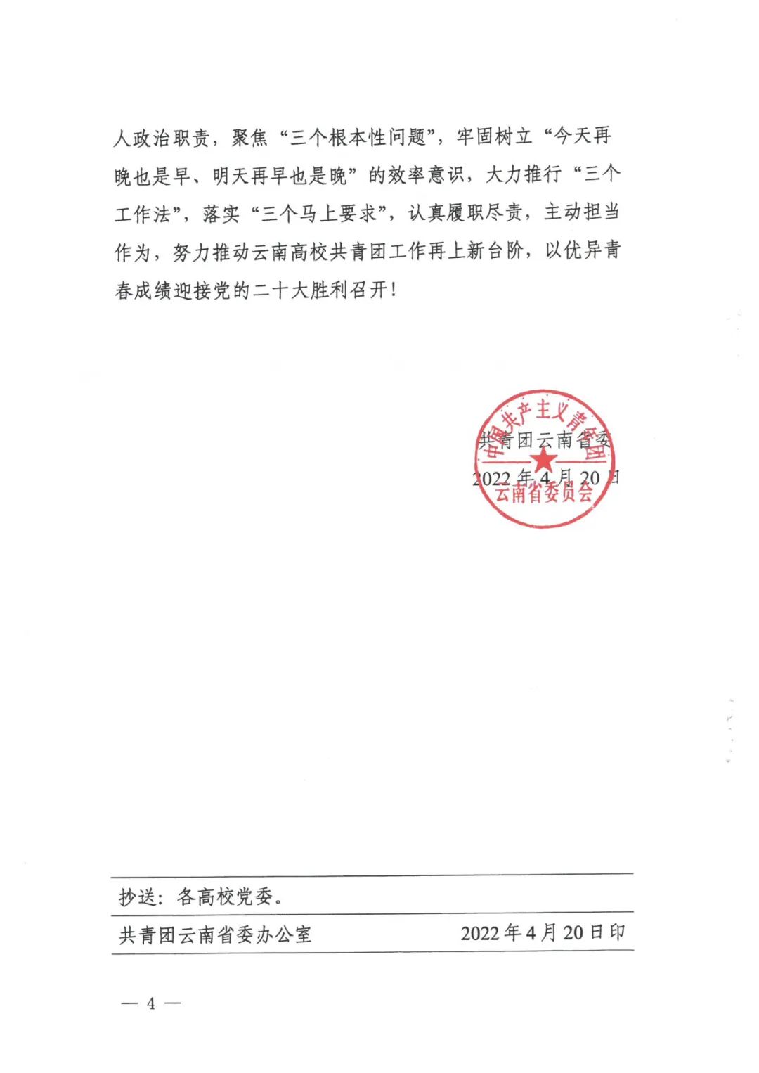 近年來,我校共青團(tuán)在上級團(tuán)委和學(xué)校黨委的領(lǐng)導(dǎo)下,堅(jiān)持團(tuán)結(jié)帶領(lǐng)全校團(tuán)員青年,著力改革創(chuàng)新,推進(jìn)從嚴(yán)治團(tuán),緊緊圍繞構(gòu)建“凝聚青年、服務(wù)大局、當(dāng)好橋梁、從嚴(yán)治團(tuán)”四維工作格局,全面開展“思想引領(lǐng)、主題活動、組織提升”三項(xiàng)體系建設(shè)工作,團(tuán)的各項(xiàng)事業(yè)取得長足的進(jìn)步。獲評“好”的殊榮,是來自共青團(tuán)云南省委對我校全體團(tuán)員青年的認(rèn)可,也是對我校團(tuán)委工作的肯定。下一步工作中,校團(tuán)委將再接再厲,著力改革創(chuàng)新,力爭取得突破性進(jìn)步。堅(jiān)持“黨建帶團(tuán)建、團(tuán)建全覆蓋、工作到支部”的思路,擴(kuò)大團(tuán)組織的覆蓋面,增加學(xué)生課余活動,提升學(xué)生綜合能力,豐富學(xué)生業(yè)余生活,更好的服務(wù)全體師生,以優(yōu)異成績迎接黨的二十大的召開。