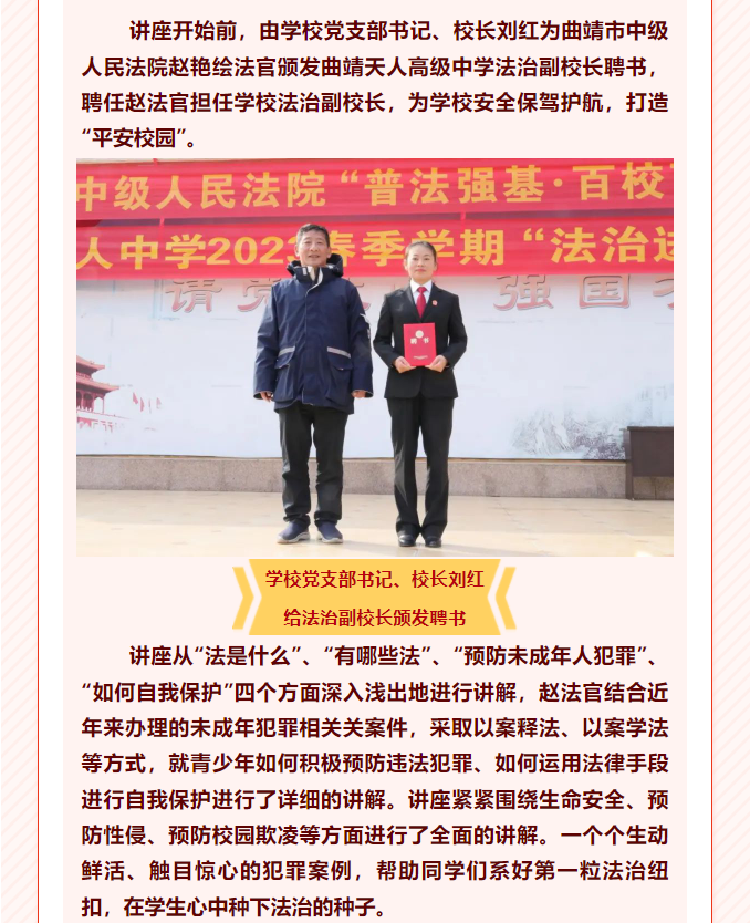曲靖天人高級中學開展“普法強基,法護青春”法治教育專題講座